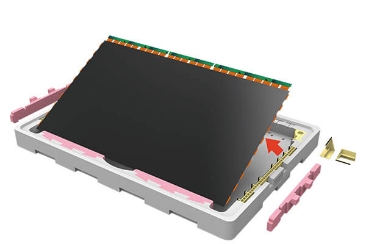 TFT-LCD 面板尺寸多样化是不可避免的趋势,也因此导致停产机种产生大量闲置玻璃运输箱,“移动式档块设计”于箱底及箱盖预留固定卡槽,让档块可垂直和水平移动以调整装片尺寸,即使产品停产后也能藉改变文件块位置再给其他新机种使用,可达成运输箱重复使用并减少新模具开发费用; 且档块是由两种发泡倍率堆栈,低倍率用以固定文件块位置, 高倍率则提供缓冲用以提升保护性;档块可藉由箱底及箱盖卡槽固定于任意位置,不需多余料件支撑于墙面可节省材料成本,甚至可依需求装载不同尺寸面板以增加共享性, 减少新包材的开发。