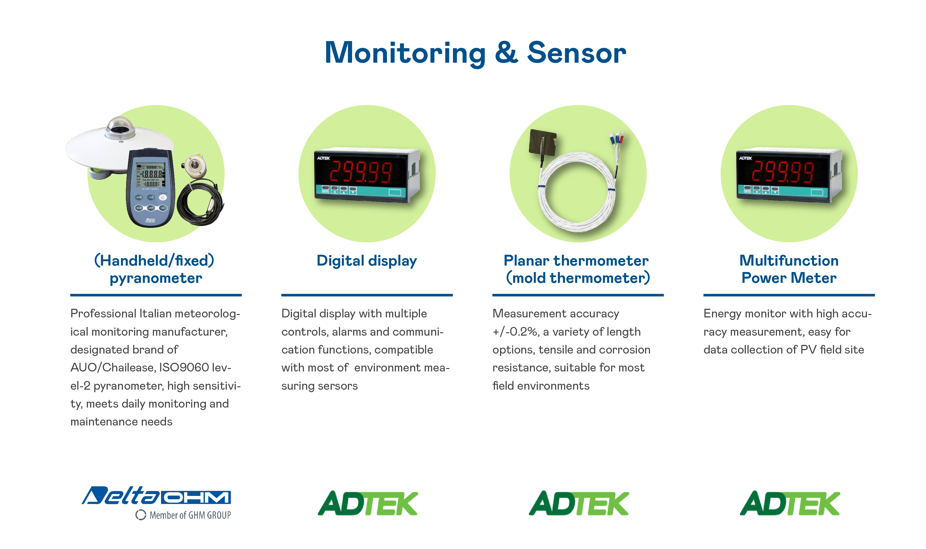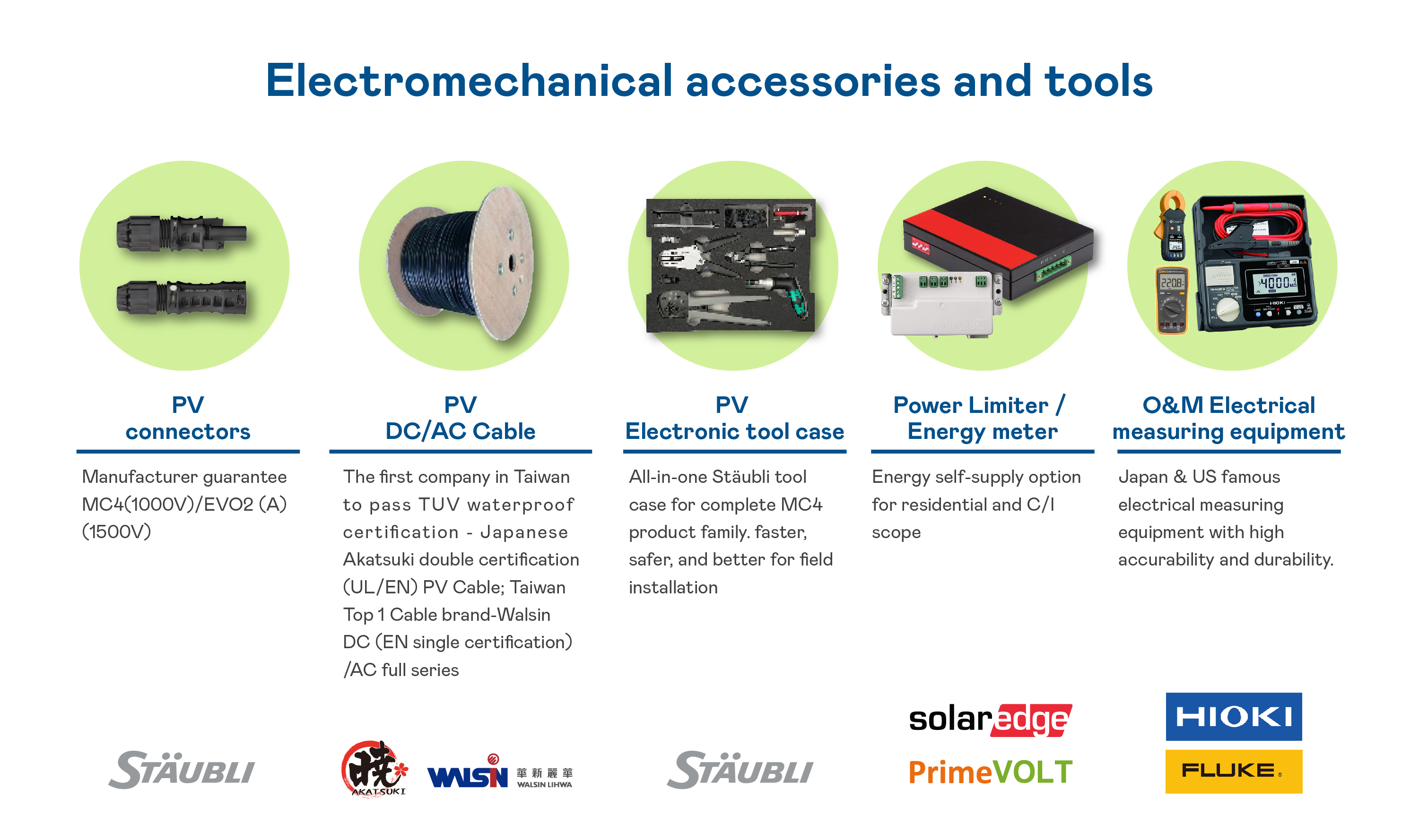 With its "one-stop shopping" service, HTH not only possesses its own solar modules, monitoring, software and hardware integration solutions, it also provides other reliable, high-quality components and products for the solar power plants of customers, including important components, such as converters, connectors, wires and cables, and component products, such as environmental monitoring devices, related auxiliary materials and tools.