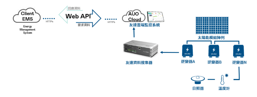 業主提供資料輸入口向AUO 雲端監控系統要求資料,AUO 雲端監控系統依據要求回應資料 |